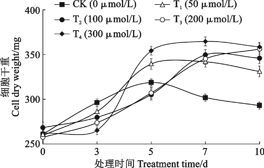 在4℃低温胁迫下,各浓度MT处理的葡萄悬浮细胞干重在培养周期内均呈先增加再减少最后趋于平稳或降低的趋势,基本呈S形曲线。在培养初期(0~3 d),所有处理悬浮细胞的生长都较为平缓,干物质增长量较小。其中,CK、T1和T4处理的细胞干物质增长速率均在第3—5天最大,第5天后增幅明显降低;CK和T1处理细胞干重均在第5天达顶峰,之后均呈下降趋势,而T4处理细胞干重在第7天达顶峰(339.50 mg),并显著高于其他处理。T2和T3处理细胞干重增长速率在第3—7天最大,T2处理细胞干重在第7天后开始下降,而T3处理细胞干重始终持续增加,在第10天达顶峰,并与T4处理接近(图1)。同一时间各浓度MT处理细胞干重在第3天均不同程度低于CK,在第5天T2和T3处理仍不同程度低于CK,在第7天以后均明显高于CK。以上结果说明外源MT处理能有效缓解低温胁迫对葡萄悬浮细胞生长的影响,且随着MT浓度增加,低温对悬浮细胞生长的影响减小。