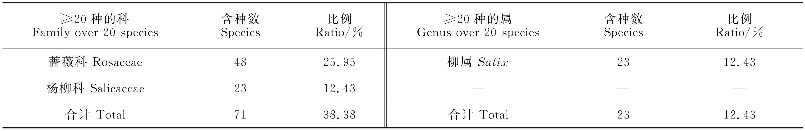 按照分级划分科属(表2、表3),从科水平来看,寡种科数>单种科数>中等科数=较大科数>大科数,寡种科(2~5种)数量最多,共11科38种,占所有科的42.31%,占所有种的25.95%。大科(20种以上)包含蔷薇科(Rosaceae)和杨柳科(Salicaceae)2科71种,占总种数的38.38%,是齐齐哈尔地区灌木植物的优势科,尤以蔷薇科占绝对优势,占总科数的25.95%。从属水平来看,寡种属数>单种属数>中等属数>较大属数>大属数,寡种属(2~5种)占总属数的50.88%,大属(20种以上)仅有柳属(Salix)1属23种,占总种数的12.43%,是齐齐哈尔地区灌木植物的优势属。