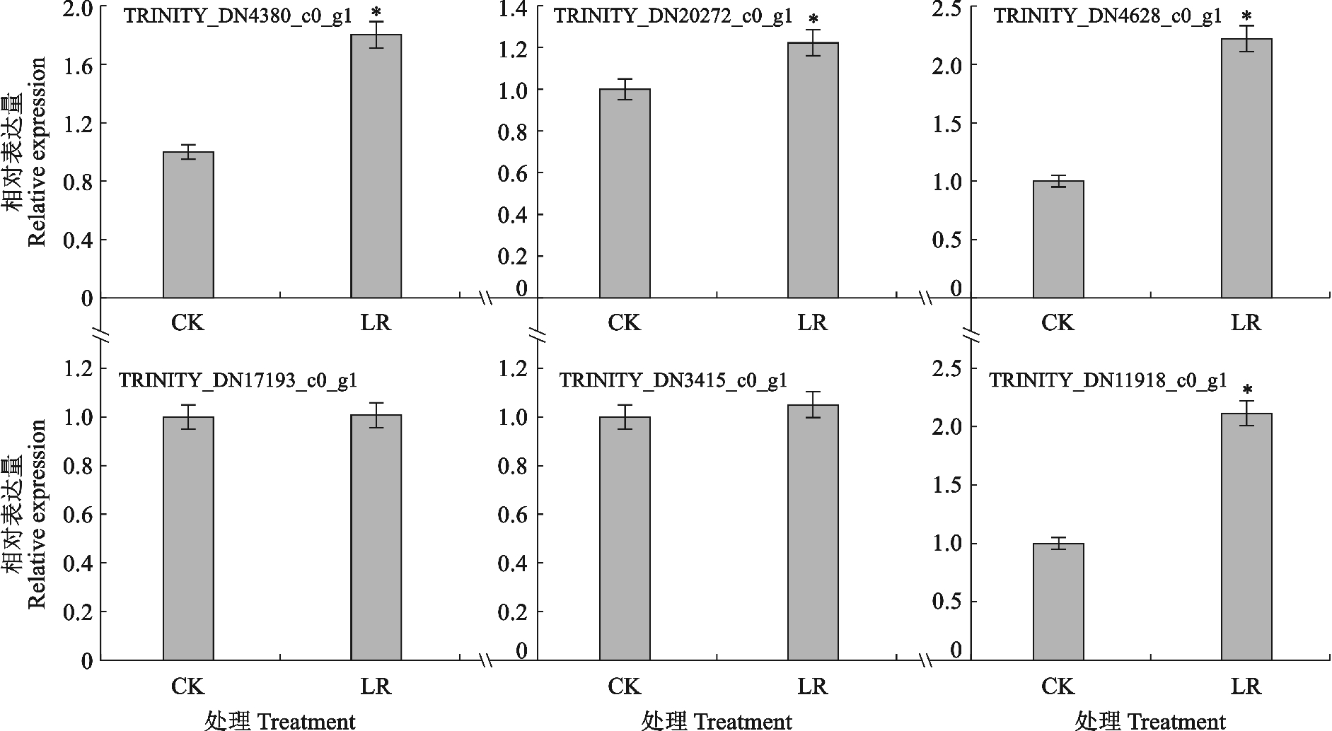 为了验证转录组结果的准确性,从3个通路中选取6个DEGs进行qRT-PCR分析。如图8所示,其中TRINITY_DN3415_c0_g1和TRINITY_DN17193_c0_g1的表达量虽然有所增加但未达到显著性水平,而TRINITY_DN4380_c0_g1、TRINITY_DN4628_c0_g1、TRINITY_DN20272_c0_g1和TRINITY_DN11918_c0_g1的相对表达量则呈现出显著上升的趋势。这6个DEGs的相对表达量与测序数据的变化趋势完全一致,进一步证明转录组数据的准确可靠。
