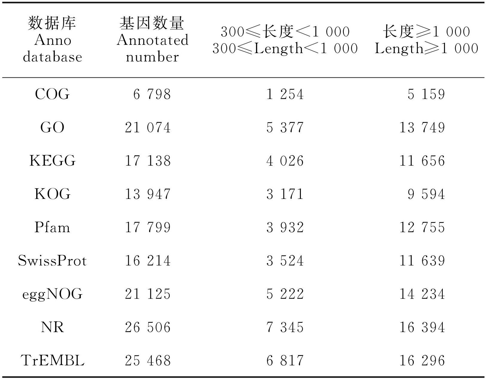 用Trinity对高质量数据进行拼接,共获得143 212个转录本,总长度高达197 917 892 bp,其中N50的长度为2 195 bp。组装后共得到62 938个unigene,总长度为69 137 180 bp,N50的长度为2 070 bp,说明整体数据可靠,为后续分析奠定了基础。其中在[200,300)bp的unigene数目最多(表3),有14 852条,占比为23.60%;在[1 000,2 000)bp的数目最少,有10 479条,占比为16.65%。