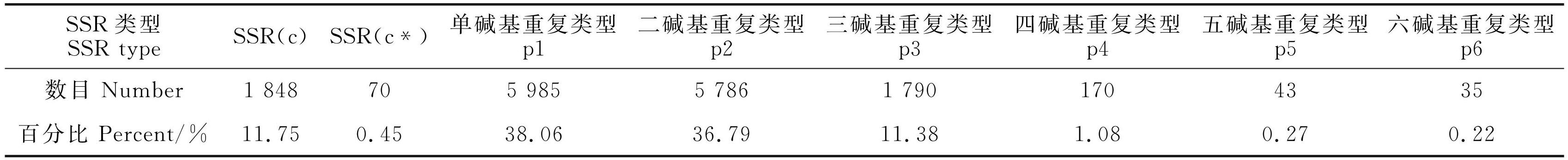 通过MISA(https://webblast.ipk-gatersleben.de/misa/)对桔梗转录本进行SSR检测,共检测到15 727个SSR位点。所有碱基重复类型中,单碱基重复类型最多(p1: 5 985);最少的是六碱基(p6: 35),仅为单碱基重复的0.58%。其他SSR类型分别包含1 848个复合型SSR(c),70个SSR之间有重叠的复合类型SSR(c*),5 786个二碱基重复(p2),1 790个三碱基重复(p3),170个四碱基重复(p4)和43个五碱基重复(p5)(表7)。
