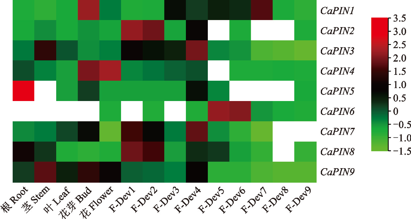 PIN基因在辣椒不同组织和果实发育9个时期的组织表达热图,分别是5个破色前期[0~1 cm(F-Dev1)、 1~3 cm(F-Dev2)、3~4 cm(F-Dev3)、4~5 cm(F-Dev4)长的果实和绿熟果(F-Dev5)]、破色期[果实开始变红的时期(F-Dev6)]和3个破色后期[破色后3 d(F-Dev7)、5 d(F-Dev8)和 7 d(F-Dev9)]。热图中红色深浅反映了基因表达的强弱,颜色越深表示表达量越高,白色表示基因未表达。