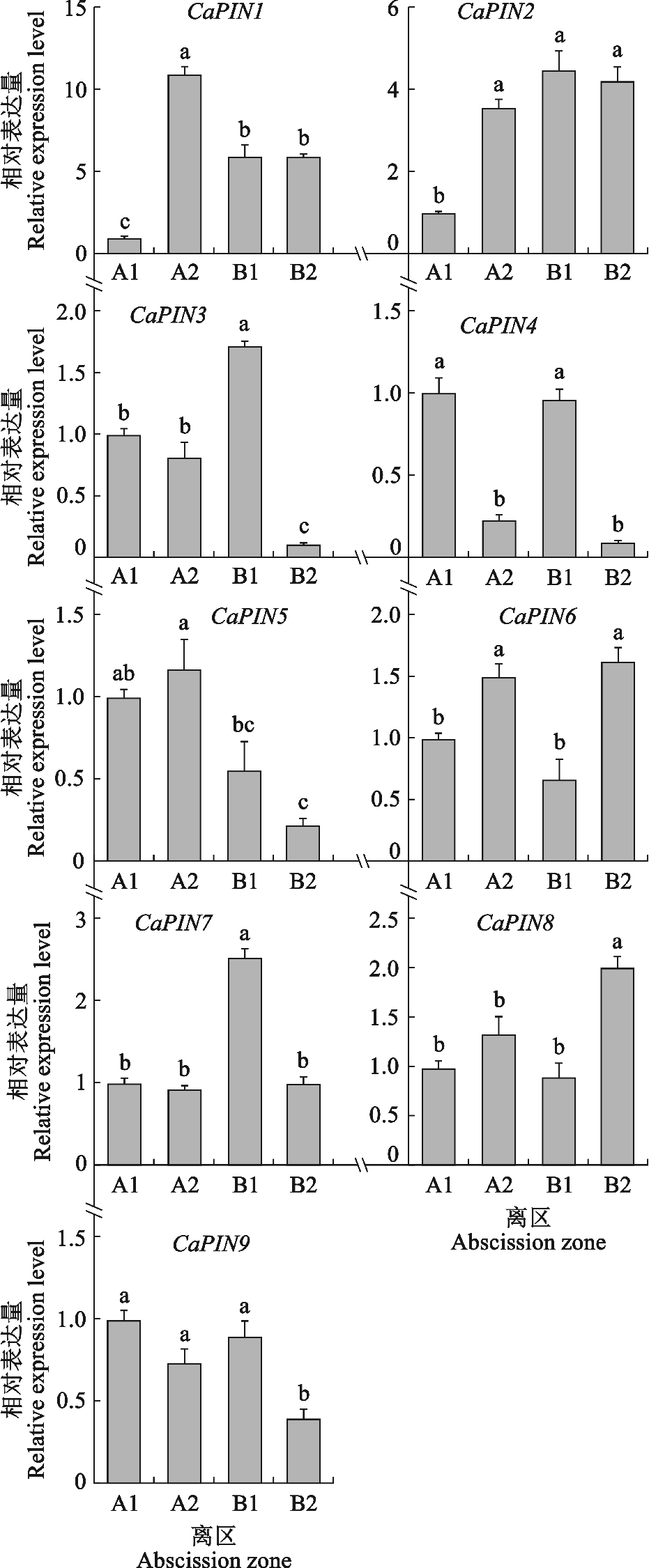 由图9可看出,CaPINs在‘HX’和‘HC’中有相似的特异性表达模式,CaPIN1与CaPIN2在离区组织(A2、B1)中高于(A1、B2);CaPIN3、CaPIN4、CaPIN7和CaPIN9在果实端的离区组织(A1、B1)表达量高于枝干端的离区组织(A2、B2);CaPIN5、CaPIN6和CaPIN8在枝干端的离区组织(A2、B2)表达量高于果实端的离区组织(A1、B1)。以上结果说明CaPINs参与了辣椒果柄生长素运输和分布调控。
