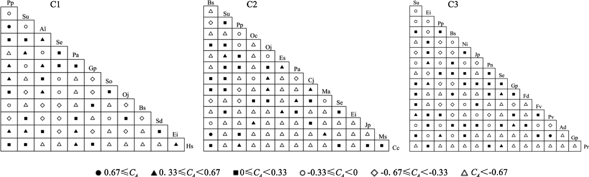 式中:CA取值范围为[-1,1],CA越接近1表示物种间的正关联越强,反之则表示种间负关联越强;当CA=0,表示两者独立出现。