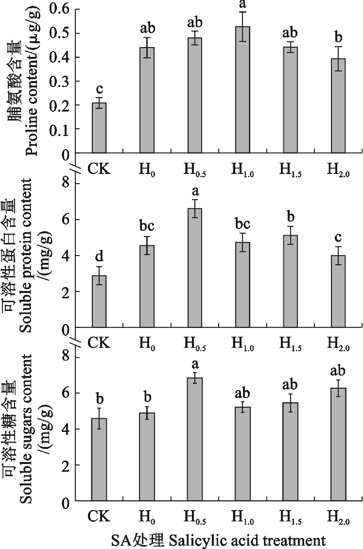 由图6可知,H0处理西瓜幼苗叶片的脯氨酸和可溶性蛋白含量均较CK组分别显著升高1.10倍和58.61%,而其可溶性糖含量较CK组无显著性差异;施加SA后,脯氨酸含量较H0处理组无显著性差异,但施加0.5 mmol/L SA后,H0.5处理组可溶性蛋白含量较H0处理组显著升高45.17%,H0.5处理组可溶性糖含量较H0处理组显著升高39.86%可溶性蛋白和可溶性糖含量也仅在H0.5处理下显著高于H0处理,增幅分别为45.71%和39.86%,在其他浓度SA处理下也无显著变化。