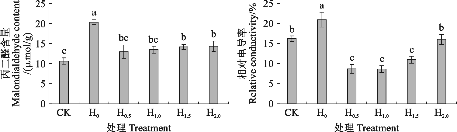 由图4可知,高温胁迫后各处理MDA含量均比CK升高,其中H0处理较CK组显著升高47.65%,各浓度SA处理MDA含量均显著低于H0处理,H0.5和H1.0处理还与CK相近;随着SA浓度的升高,MDA含量呈现逐渐上升的趋势,H0.5处理较H0处理显著降低36.10%。H0处理相对电导率较CK组显著升高4.71%;各浓度SA处理相对电导率均显著低于H0处理,H0.5、H1.0和H1.5处理还显著低CK组,其中H1.0处理对西瓜幼苗叶片相对电导率的下调效果最好,比H0处理显著降低12.26%。
