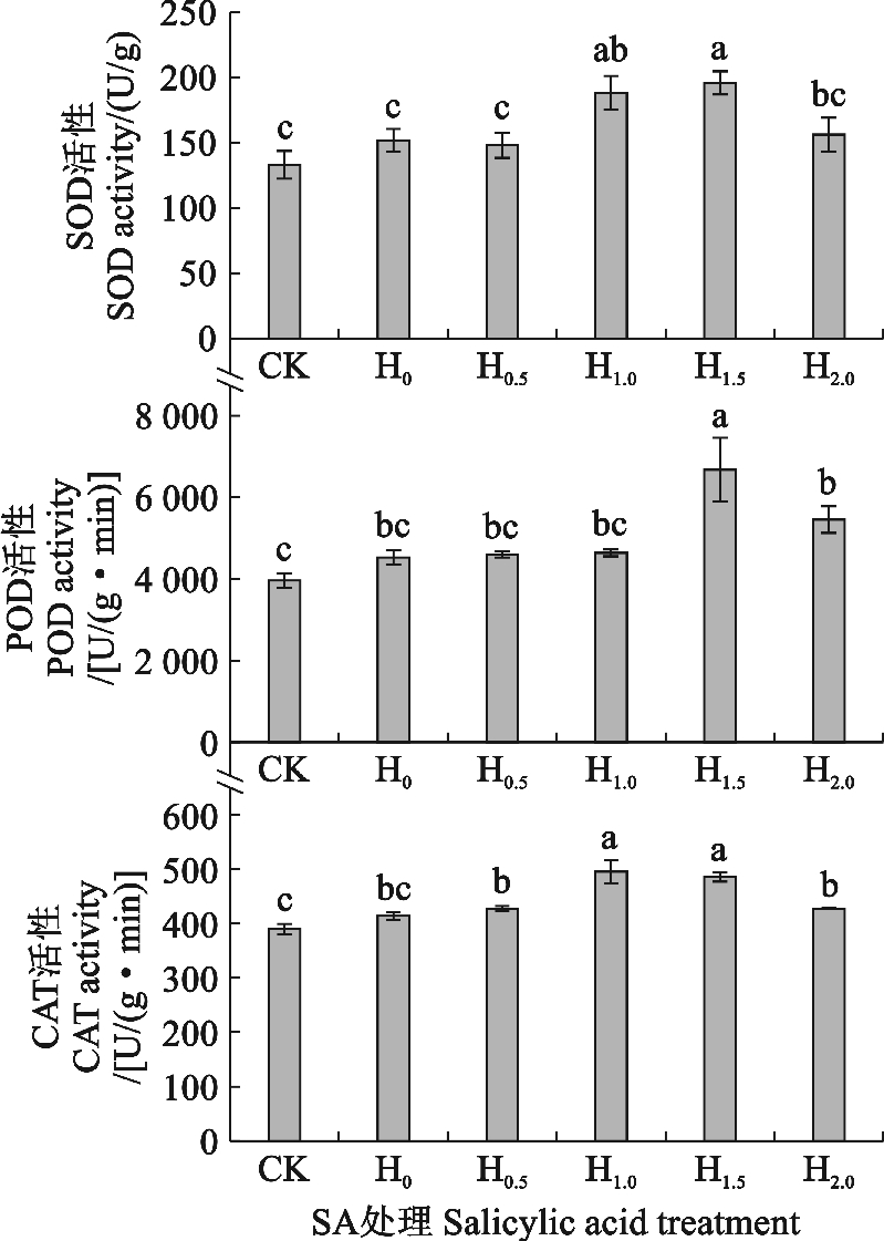CK为常温无SA处理,H0,H0.5,H1.0,H1.5,H2.0分别表示叶面喷施0,0.5,1.0,1.5,2.0 mmol/L SA后进行42℃高温胁迫处理。下同。